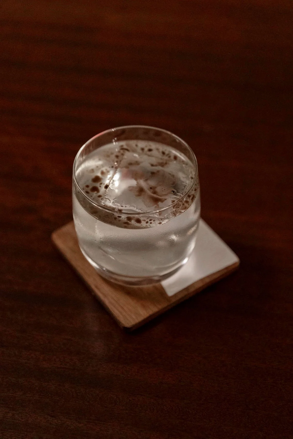 Pull a large 2x2 cube from the freezer and let it temper in a large rocks glass. Build all ingredients except for the oil in a mixing glass and fill the mixing glass with hoshizaki ice. Stir to chill. Strain over a large cube and place 3 drops of 'boiled oil’ on top as garnish. When placed in front of the guest, swirl the top of the drink using tweezers or a skewer to disperse the oil.