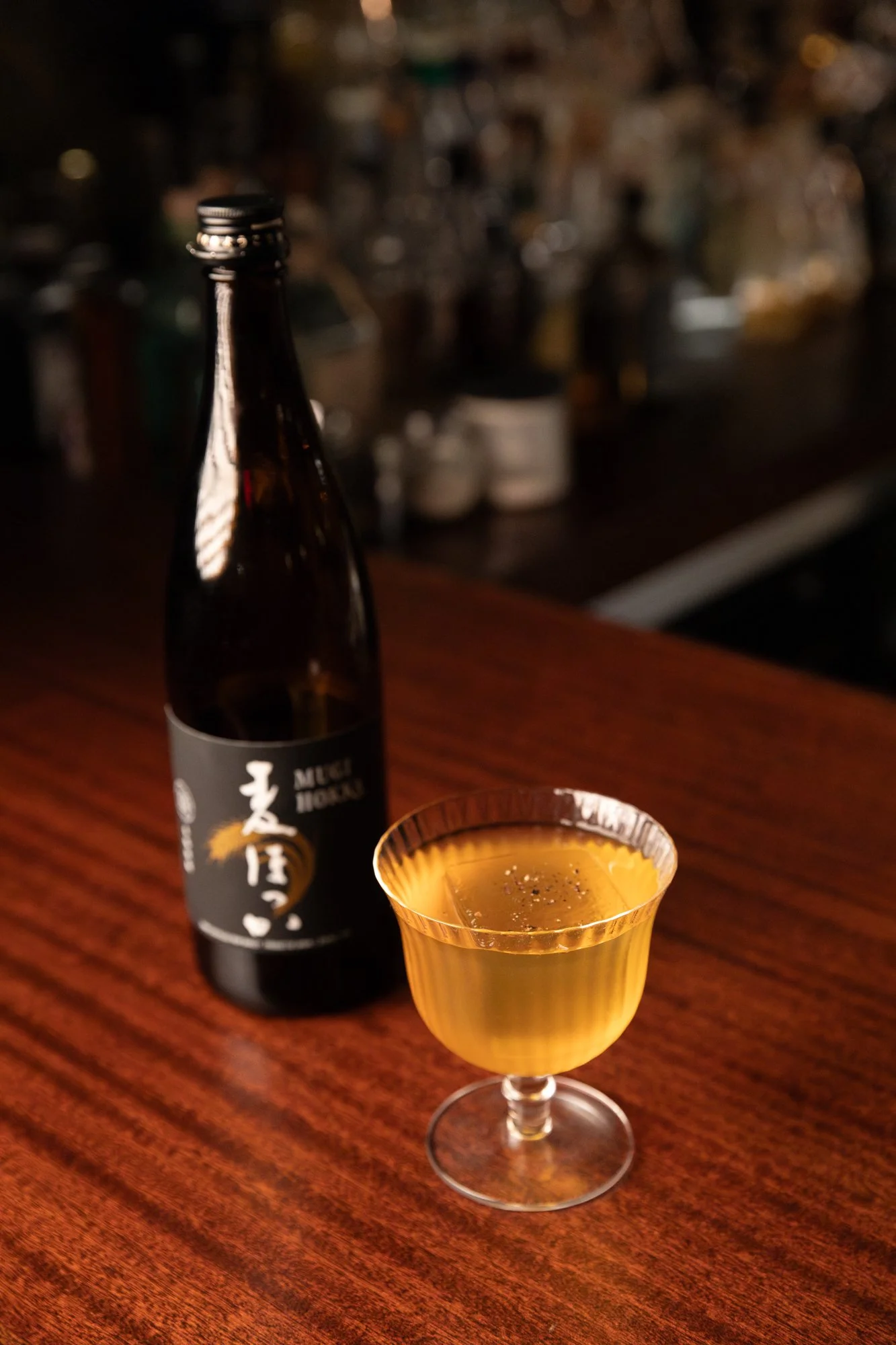 This is a stirred cocktail that is served on large-format ice. The recipe consists of (1) Mugi Hokka, (2) a custom made miso kabocha caramel, which gives the cocktail it's earthy, umami sweetness, (3) a custom made acid adjusted mandarin cordial that serves as both acidic and bitter components in this cocktail, (4) Giffard Piment d'Espelette for a subtle warming spice, (5) Black Pepper bitters to complement the liqueur and aroma, and (6) freshly ground black pepper that serves as an aromatic and a visual cue at the spice in the cocktail.