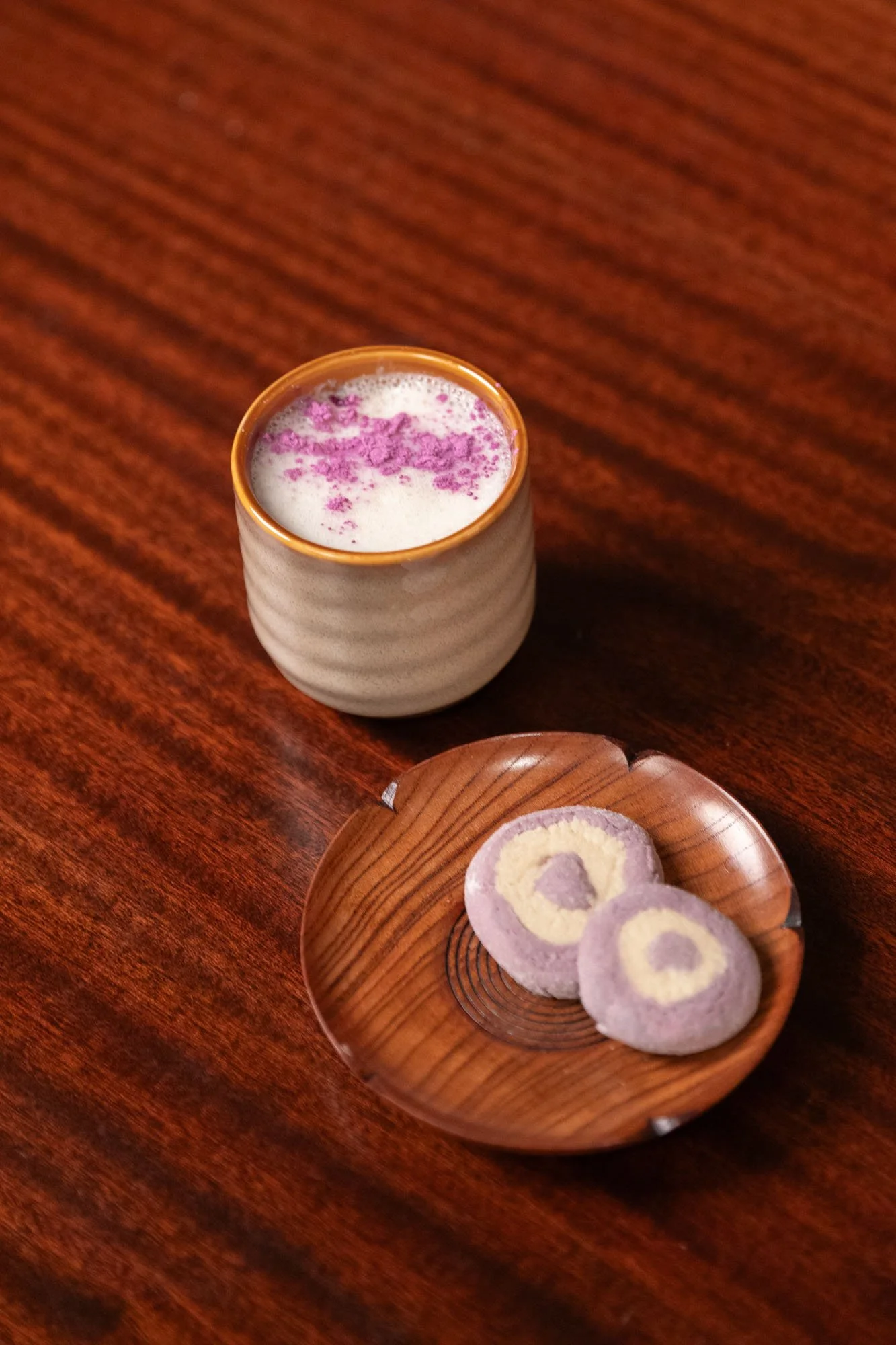 Garnish: Murasaki Imo Powder (Japanese Purple Sweet Potato Powder), side of a Janome Cookie (Snake-eye cookie)